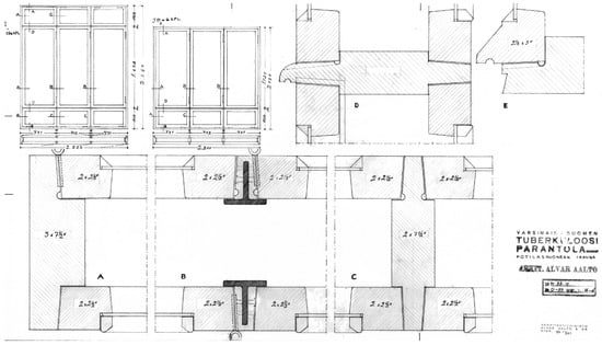 Aalto was more interested in using industrially-produced, shallow-profile steel windows than standard wooden windows (Figure 6a,b and Figure 7). In the early stages of the work, the Building Board had agreed on the use of steel windows on the condition that they were Finnish. However, Finns needed to import the steel profiles, and in the recession of the early 1930s, the public projects had to favor the local production and workforce. For this reason, Aalto never invited tenders from window manufacturers abroad, whose products he had used in his former work. Made-to-order steel windows manufactured in Finland out of imported profiles too expensive. When the final decision was made not to equip the patient rooms with steel windows, Aalto developed a new type of wooden window that employed some steel profiles. The window resembled remotely a traditional ventilation window, known as the “health window,” only this time it was horizontal in orientation.