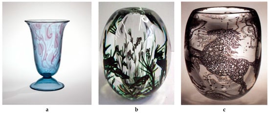 (a) ‘Intarsia’ vase (1920–1929), made by Steuben Division and Johnny Jansson in the Corning Glassworks, USA. Height 174 mm. The Corning Museum of Glass collection. (b) ‘Graal’ fish vase (unknown), made by Hald, Edvard Niels Tove (1883–1980) in Orrefors Glasbruk, Sweden. Height 132 mm. The Corning Museum of Glass collection. (c) ‘Horse’-Mykene glass vase (1936), made by Vicke Lindstrand in Orrefors Glasbruk, Sweden. Photographic source: from Ray Flavell’s PhD thesis (2001) (). Used by permission.