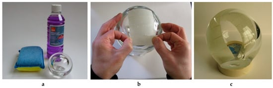 It is important to clean the surface of the parison with methyl alcohol or glass cleaner prior to the application of the masking tape (cf. Figure 3a). Masking tape (approximately 25 mm in width) is cut to between 50 mm and 80 mm, depending on the curved surface.
