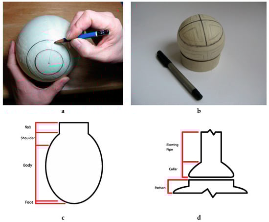 (a,b) Applying the design with a pencil and fibre-tipped pen. (c) Diagram 1: technical terms for the parison parts; (d) Diagram 2, technical terms for the parison parts and a prepared gather on a blowing pipe.