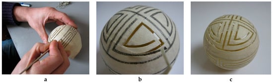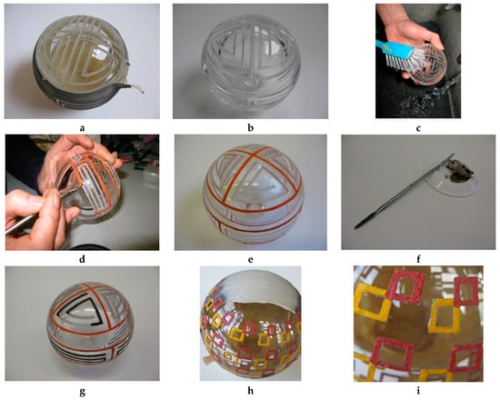 In this step, the masking tape is removed from the parison and the incised design is cleaned with water (cf. Figure 7a–c). Different shaped dental filling tools are used for packing the coloured glass powder into the incised design (cf. Figure 7d–g). Previously, the colours were applied directly into the incised design before removing the masking tape, with the silicon carbide grit removed with a paintbrush or compressed air. However, it then proved impossible to prevent contamination of the glass powder with the residue of the masking tape (cf. Figure 7h,i). This process uses Kugler coloured glass powder, which is compatible with the Cristalica glass, which the parison is made of.