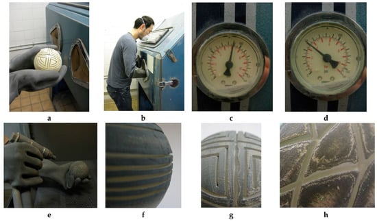 Once the cutting is complete, the design is sandblasted (cf. Figure 6a,b). The working air pressure for the sandblaster is set at between 50 PSI and 90 PSI (or 3.5 to 6 Bar) (cf. Figure 6c,d). Ninety PSI is ideal for a rough cut, as the high air pressure cuts the glass faster. When the sandblasting is close to the desired depth, a 50 PSI pressure is used to achieve a right-angled cut and an even surface. The silicon carbide grit for a sandblaster comes in various sizes, from F80 (coarse) to F400 (fine). The process under discussion uses a medium coarse grit size of F220 grade silicon carbide grit. To avoid damaging the design, the sandblaster nozzle must be maintained at a distance of between 15 cm and 20 cm from the parison, (cf. Figure 6e–h). The depth for sandblasting is approximately 2.5 mm, since this creates a sufficient void for the insertion of coloured glass powder (cf. Figure 6f). The line drawing tends to be disconnected if the depth is less than 2.5 mm, because the glass powder shrinks when it melts at high temperatures. However, if the depth is too great, the glass powder generates bubbles when another layer of molten glass is added to cover the design. The thick layer of powdered glass requires an extended reheating time in the glory hole, carrying the risk of the design becoming distorted. This occurs because the thick glass body of the parison heats up slowly, with the heat retained for a longer period of time, while the glass powder heats and cools down in a more rapid manner. Therefore, in order to avoid burning off the surface of the powdered glass, and ensuring it melts evenly, the reheating must be divided into several steps.