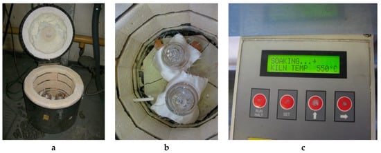 (a,b) Preparing the pick-up kiln for pre-firing. (c) The temperature of the pick-up kiln.