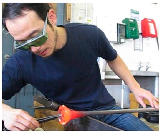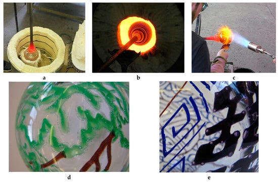 The parison is picked up on a blowing pipe and immediately reheated in the glory hole (cf. Figure 11a,b). To prevent distortion of the design, I bring the parison to the working bench (or glassblowing bench) before it becomes soft. The blowtorch can help melt the powdered glass without softening the parison’s body. Prior to applying another layer of glass, the melted glass powder needs to be compressed using a stainless steel paddle, to obtain an even surface and reduce the risk of creating air traps (cf. Figure 11c). It is crucial to ensure the powdered glass is completely melted, so it can be fused onto the parison body, avoiding the generation of bubbles when it is later covered with molten glass (cf. Figure 11d,e).
