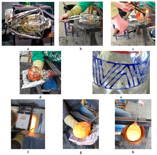 (a) Encapsulating a void with a transparent parison pushed over. Photographic source from Ray Flavell’s PhD thesis (2001) (). Used by permission. (b–e) Applying a layer of glass with a transparent glass overlay. (f–h) Gathering the second layer of glass from the furnace and shape the glass with glassblowing tools.