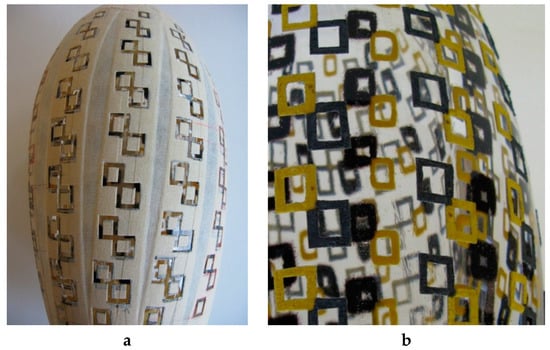 The examples of the two-layered test pieces highlight the potential for applying multiple layers of images/patterns to enhance the sense of depth in the two-dimensional image/pattern (cf. Figure 16). Each layer of glass physically creates an approximate thickness of between 15 and 30 mm, although the perceived depth is increased by the reflections and refractions of the image/pattern. This enhances the three-dimensional effect on the blown glass form by developing the ‘pictorial depth cue’ (or depth perception), such as interposition9, linear perspective10, and relative size11. In ‘Tulip pattern’ tests 1 and 2 (2012), the tulip pattern on the second layer covers some parts of the pattern on the first layer, while the reflection on the inner surface of the bubble (which appears smaller) enhances the appearance of perspective (cf. Figure 16b,d).