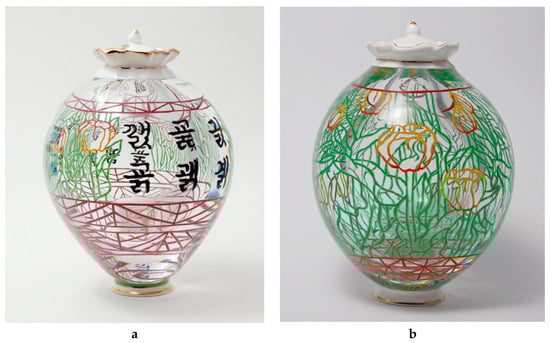 My understanding of the unique properties inherent in glass, in conjunction with my investigation into the possibilities and limitations of the inlaid colouring technique, led to the development of a series of ‘Korean glass’ (cf. Figure 18). This artwork takes the recognisable pattern of the English manufactured porcelain teapot and its forms, juxtaposing them with counterfeit Korean letters and patterns placed over the glass body, to question the authenticity of the object in terms of its cultural origin. Although viewers in the UK readily recognise the porcelain elements and engage with the familiarity of the mediums (i.e., porcelain and glass), they tend to view ‘Korean glass’ as an Oriental object, as a result of the pseudo-Korean design interrupting the first visual message, in which they identified something familiar. As such, it becomes a powerful dominant reference throughout the course of the British viewer’s visual experience of the work. However, conversely, the counterfeit Korean letters, the patterns on the porcelain, and a lack of familiarity with glass as an artistic medium, lead Korean audiences to view the object as ‘foreign’, or as something made by a foreign artist to imitate a Korean object. Korean restaurants in the UK, seemingly, can provide a better understanding of the invented exotic image that satisfies locals’ expectations, but they do provoke some uneasy feelings in Koreans. I have seen many Korean restaurants in the UK with interiors that are decorated with objects from China, Japan, or Southeast Asian countries, which are often perceived as offering an authentic Korean image by local customers. However, Korean customers can identify this as a ‘constructed’ or ‘false’ image, which then provokes some uneasy feelings of ‘embarrassment’ or ‘frustration’ in them.