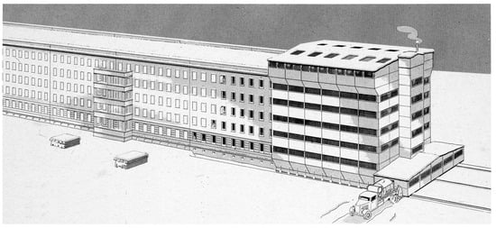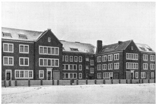 Already in the years 1908–1910, as an employee of Peter Behrens (1868–1940), Gropius became acquainted with a cooperation of architecture and industry. Working for Behrens, who, as the artistic advisor of Allgemeine Elektricitäts-Gesellschaft (AEG), was responsible for the design of all the company’s buildings, products and printed matter, Gropius learned about the “refinement of industrial work in a collaboration of art, industry and crafts” in the sense of Deutscher Werkbund (; ). The design of the AEG products, as Henning Rogge summarizes, is characterized by the fact that it “originates from forms designed for machine and mass production, from types developed for appropriate materials, and, where possible, builds on existing forms” (). In addition, with the workers’ rental houses in Henningsdorf (1910–1911)—Behrens’ first workers’ housing project built at about the same time as the AEG porcelain factory—Gropius encountered the idea of a Siedlung that “consists of a single wing of three-storied houses built as a continuous row-building” (Figure 1). As Fritz Hoeber pointed out as early as in 1913, “this method of construction (…) not only has the advantage of being of the greatest economic efficiency”, but also, “above all, to appear as with an architecturally cohesive entity” (; cf. ; ).
