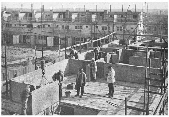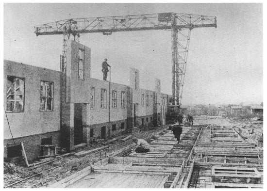 From 1925 onwards, Ernst May employed for the Siedlungen of Das Neue Frankfurt the especially developed “Frankfurter Montageverfahren” (‘Frankfurt assembly method’; , ; , , ; cf. ; ). Like the Occident building system, it was based on large prefabricated panels and slabs (Figure 3). However, May was successful in compensating for its disadvantages and to advance it considerably: On the one hand by improving on the construction method itself, i.a. by subdividing the panels and slabs into smaller formats, by using light pumice instead of heavy slag, as well as a method of assembly allowing for more dimensional tolerance; on the other hand, also by building on a much larger scale. And with the establishment of a dedicated prefabrication factory, it was possible to make the production less dependent on the weather, to introduce “assembly line work” (‘Fließarbeit’), to partially eliminate manual work, to save on molds and material and to improve the quality of the slabs. In doing so, May not only achieved a significant rationalization success, but also accomplished a corresponding architectural progress. He wrote, “the assembly process enforces objectivity and clarity in design” ().