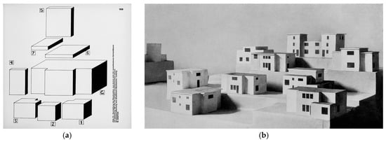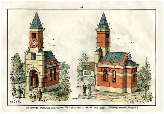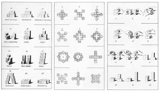 The “Anker-Steinkasten” (Figure 4) refers to the most famous of the numerous construction kit or system toys then available. It was invented in the 1870s by the brothers Otto and Gustav Lilienthal (1848–1896 and 1849–1933 respectively), the famous aviation pioneer and his brother, a master-builder and social reformer; in 1880 it was patented by the entrepreneur Friedrich Adolf Richter (1846–1910) and from 1882 onwards mass-produced (cf. ; ). The Anker blocks are geometrically shaped forms that are pressed with great precision from sand, writing chalk and linseed oil and then baked; and they are primarily produced in the primary colors red, yellow and blue. The blocks are assembled according to special manuals to form complex architectural models without using glue or fixation, just observing the laws of structural physics (cf. ). The idea of the construction kit as a toy largely dates back to the educator Friedrich Fröbel (1782–1852), who developed a series of so-called Spielgaben, in which playing with the basic geometric blocks, using the kits devised by him, has an essential role. For instance, the various divisions of a cube form the basic shapes of the 3rd to 6th kits of Spielgaben (cf. ; Figure 5). Fröbel exerted a considerable influence on the teaching at the Bauhaus as a model in pedagogic matters (cf. ; ; ; ). He was also honored with the project of the Friedrich-Fröbel House in Bad Liebenstein, which was designed by Walter Gropius and Adolf Meyer (1881–1929) in 1924, on the occasion of the 75th anniversary of Fröbel’s death, but which was unfortunately never built (cf. ).