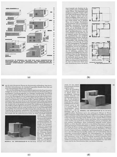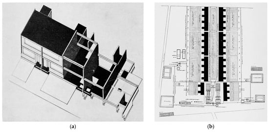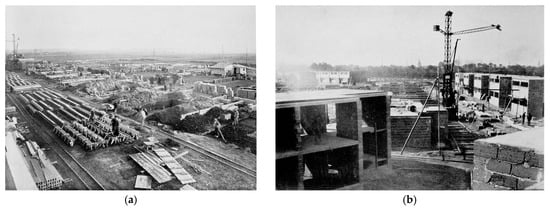 During the design process, in a way unique in housing, “all the plans are drawn on a scale of 1:20” by Gropius and his collaborators, “before contracts are awarded, so that even all installations—gas, water, light, heating—are fixed beforehand, including all dimensions and wall penetrations”. For the construction process, a 1.5 t tower crane was employed, whose rail track system defined the “production axis” of the construction process—in a way vaguely similar to the linearity of the assembly line (Figure 16b and Figure 17a,b). Gropius stated that the “rational arrangement of the construction site” provided both the layout for the Siedlung, as well as the arrangement of the houses—in parallel, mirrored rows. With the help of a precise construction site plan, the slag concrete hollow bricks and concrete beams were manufactured “on the site itself with machines in an assembly-line-like process (…) systematically reducing idle times and friction losses.” Every worker was encouraged to increase his performance according to the assembly-line principle by repeatedly executing the same task over and over again ().