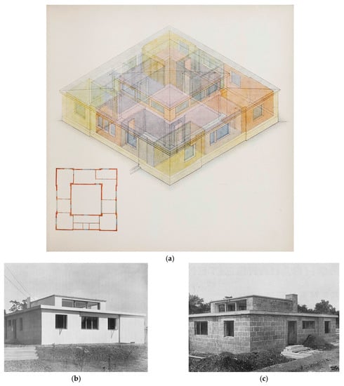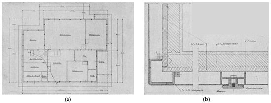 It is typologically derived from the “honeycomb” system—the various rooms of the square plan are grouped around a raised central living room lit by fanlights (Figure 8a,b). The house is however conventionally built and no dry construction method is used (Figure 8c). The walls are made with so-called Jurko blocks—large, mortar-bonded slag concrete blocks; the ceiling is a Berra hollow stone ceiling (‘Berrahohlsteindecke’)—one of the many reinforced light concrete brick systems of the time with a triangular cross-section, very economic reinforcement and little concrete cover (; ; cf. ).