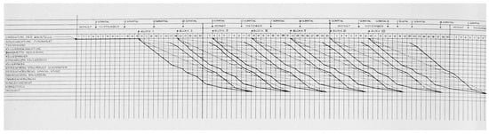 The organization of the work processes, as well as the synergy of the individual construction phases, was precisely directed by a pre-planned schedule. Gropius used the “Arbeitsgraphikon” (‘work graph’), a combination of a bar graph and a scheme “in the manner of a railway operating plan” first developed by the Soziale Baubetriebe (, ; ; Figure 18). This type of presentation of a rationalized serial house production goes back to Adolf Loos (1870–1933), who first developed the “System Loos” for the Siedlung Heuberg in 1921 (; cf. ), which was seen even by contemporaries as a precursor to Gropius’ concept ().