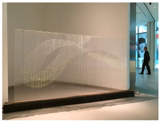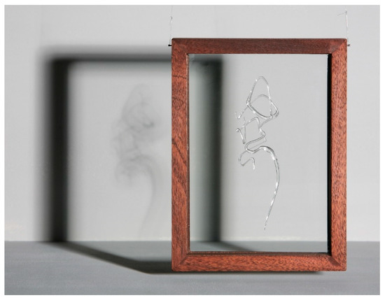 Figure 2) confirms the technical feasibility of using molten glass in a calligraphic manner, and it demonstrates the amalgamation of calligraphy and the visual connotation carried by clear glass. In this work, four Japanese characters “ゆうれい” (pronounced as yu-u-re-i) meaning ‘ghost’ are written in clear glass. These four characters are graphically arranged in the ghostly figure inside the frame, and the frame is suspended from the ceiling to achieve the floating effect. The fleeting shadow also forms a ghostly trace. As the suspended sculpture slowly sways, the projection of the shadow comes in and out of focus, enlarging and blurring.
