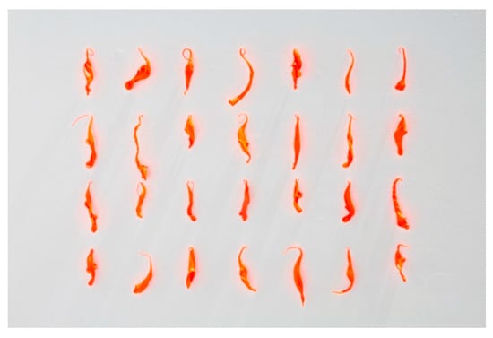 Figure 3 are waste glass pieces which artist Helen Pailing collected from the studio of Brian Jones, a scientific lampworker at the National Glass Centre. As seen in the picture, she thoroughly painted them in florescent orange paint to highlight their shapes. Each of these pieces was originally an excess section of a glass tube, which was heated, squashed, twisted, and pulled away in the course of making some kind of product. These marks were produced by Jones’s hands and they freeze the moment of when they were made. However, Jones’s attention must have been paid to the product he was making at that time, and probably he removed and threw these fragments into the bin as part of a subconscious routine.