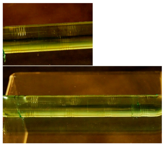 Figure 6 shows a section of a lease-rod reclaimed from a vintage weaving machine. The machine had a set of these rods, which kept warp yarns in position. Glass was used for this purpose because it did not damage the strings like metal and lasted longer than wooden rods. On the surface of the rod, a set of four notches can be observed at equal spaces. These are ‘reductive traces’ (