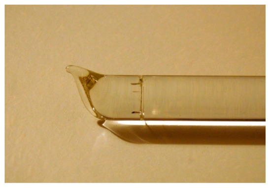 Figure 7 shows part of a glass ship, left by the late Peter Coyne, a scientific glassblower who was influential in making novelty glass products in northeast England. The end of the glass rod was nipped and slightly pulled over to create the impression of a ship’s bow and keel. The cross-sectional line is the stress crack caused by this heat. Normally, lampworkers give this stress zone a ‘lamp-annealing’ to prevent such cracks. Lamp-annealing is one of the fundamental techniques of lampworking, where the stress zone is gently heated with a lower temperature flame (i.e., using less oxygen) to release the stress. Since lampworking often includes the partial heating and fusing of small components, this quick annealing method is frequently employed in the course of fabricating a sculpture. This remnant suggests that Coyne was interrupted by a phone call or something of that kind and had to put the piece down without first lamp-annealing it. The crack is a poignant record of him having worked on this piece of glass.