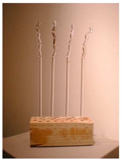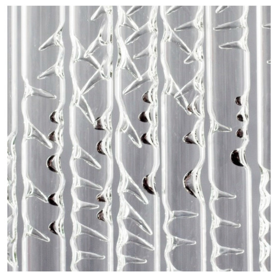 Figure 9). These are 24 mm diameter tubes, which have an internal space of 20 mm for embedding. Each spike was made by heating a small area of the glass using a sharp flame and pushing it towards the middle of the tube with a needle-like metal tool. The size and shape of the spike can be changed by using different tools, and various coloured glass elements can be added. I chose the murmuration of starlings as the inspiration to create new work using this new technique. The dynamic movement that flocks of birds display in the sky seemed to be an appropriate model to learn from and a suitable motif for capturing the flow of energy in glass.