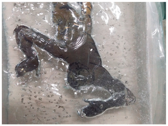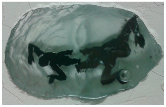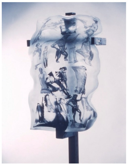 An early example of the experiments using inclusions in glass (Figure 2 and Figure 3) incorporated the immersion of screen-printing images in glass. The initial research (Bialek 2003) was concentrated, in general, on the use of inclusions (such as fabrics, metals, organic objects, clay, and images) in cast glass (including sand cast technique, cast glass in the mold, hot cast glass, and fusing). Following these experiments, the investigation began focusing on inclusions, such as prints, photographs, and holograms, and on the capabilities of controlling their shapes during the casting process. As a result of these studies, a novel technique of image transfer to glass was developed in 2000–2003, and results were published in Kevin Petrie’s (2006) book. This technique was predominantly used on the surfaces of cast and blown glass. The innovation was to fuse and/or cast multiple printed surfaces to create graphic image layers within the glass (Figure 2 and Figure 3). Applying the printings directly to flat window glass and controlling a shape of the inclusions during the fusing method was quite a straightforward process. However, slumping or casting into a mold required assembling more complicated objects than glass boxes. Additionally, the application of silkscreen printed images directly on a surface of the casting glass created problems, as the surface of the glass is never perfectly flat.