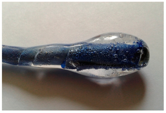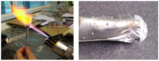 However, in some cases, bonding between metal and glass does not have any impact on the entire process, even if the COEs of both materials differ. Conducted experiments (Figure 6) proved that gallium, which turns into a liquid at temperatures greater than 29.76 °C, is such a metal. Gallium wetted the glass surface and built a very strong bond; however, because it stays in a liquid state during the entire heating and cooling process, it has an elastic bond with glass and, hence, it may be used as a compatible inclusion in glass.
