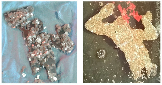 Initially, experiments applying metal inclusions into glass were carried out using hot pouring, cast glass technique, and fusing technique. The results and conclusions are outlined in Table 2. During the heating process, when the glass is still solid, the metal inclusions are exposed to air at a high temperature. In many cases, this causes deformation and discoloration of the metal surface. As a result, studies were also directed to find better techniques to overcome these problems.