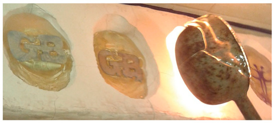 To increase the possibility of using metal inclusions in glass, it is necessary to introduce appropriate lubricants or separators. A metal lubricant has to be applied to stop the process of wetting metal by glass in the hot stage, and a separator has to be applied to prevent oxidation of the metals and keeping the cast object clean from mold components. Experiments (Figure 8, Figure 9, Figure 10, Figure 11 and Figure 12) showed that many materials can fulfil these roles. Furthermore, even iron rust flakes or Gallium can also act as a separator or lubricant to prevent problems of incompatibility between some metals and glass (Bialek 2017, pp. 164–71).