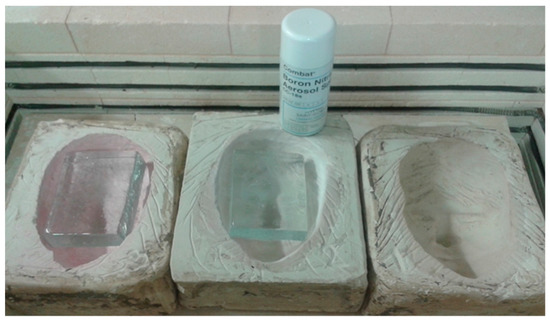 Experiments showed that the best separators between glass and the main body of the plaster mold are a layer of shelf wash and/or china clay with the addition of boron nitride (white graphite) on the top surface of the mold. These molds are high temperature resistant moulds, up to 900 °C (Figure 11).