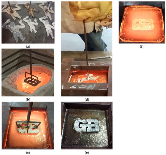 Stamps to make indentations in hot glass and application of lead and tin alloy inclusions: (a) Three sizes of nickel alloy stamps and lead and tin alloy inclusions exactly in the shape of the stamps; (b,c) indentation made by a stamp in the GB shape; (d) indentation made by a stamp in a man silhouette shape; (e) application of lead and tin alloy inclusion; (f) lead and tin alloy inclusion covered by second layer of hot glass; created by author.