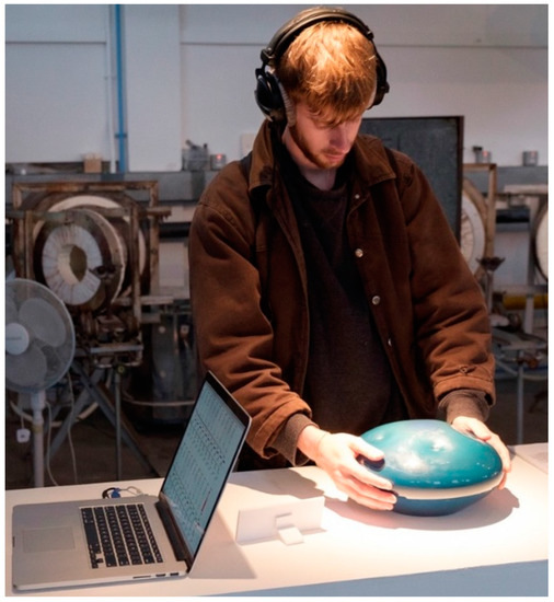 “Sounding Glass”, while related to these other instruments, differs significantly in that the physical glass of the object is not the emitter of the instrument’s musical sounds. Rather, it is an engineered, silent agent through which embedded sounds of the glassmaking are conveyed to the audience. The object’s physical form (a convex, shallow vessel with dimples) is designed to directly reference the musical Hang or handpan, a metal instrument requiring both engineering and sonic sculpting in its making (Venuti 2018). Referencing the handpan with the object form is intended to alert the audience that the piece is played by hand. Handlers play “Sounding Glass” through touch and gesture, initiating the project’s source audio recordings and/or the new virtual instrument sounds. These sounds were carefully selected and orchestrated together, sonically, to operate as one cohesive instrument of performance. The physical contact of hand on glass sends digital signals to a computer program that outputs sound to the audience through headphones (see Figure 8). In exhibition4, the computer program that mediates the sound is displayed alongside the glass object so that the audience can also examine its audio engineering and programming, as its numbers and meters visually fluctuate during user interaction (also Figure 8).