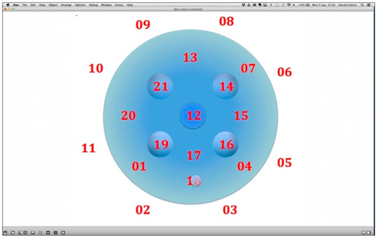 The composer, with the lead designer, mapped out where they wanted the touch points to be located on the glass object (Figure 10). To identify the touch points, they handled the prototype and discussed how a visitor might approach the glass form. The four prominent dimples on the glass object were both visual and physical focus points, cues like those of a Hang/handpan (Venuti 2018). The pair decided that these should be markedly different from the other touch points. Each dimple would end up being mapped to trigger different, active and dynamic source sounds of the glassmaking process (e.g., marvering, flashing hot glass in water). The remaining topside of “Sounding Glass” was linked to various passive and static source sounds from the hotshop, such as the steady running furnace, while the underside of the object was set up to trigger selected virtual instrument sounds created by the sound design team.