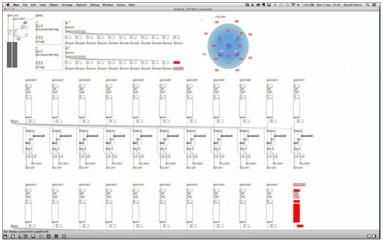 Max/MSP (Cycling ’74, San Francisco, USA) screenshot showing real-time capacitance levels for each copper strip sensor, determining which sound files play back at correlating volumes (Image: David Faleris 2016).
