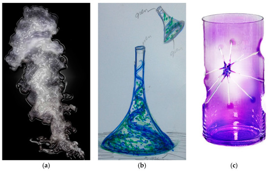 For “Glass in Translation” three newly developed virtual instruments from the glassmaking source audio were the focal points. The team that worked on “Glass in Translation” included the lead designer, the lead composer, three glass artists, and two audio engineers/sound designers. The project aimed to highlight the use of the metaphorical language and analogies found in the dialogue among the team members, especially that of the audio engineers as they worked to articulate their design and processes during the collaboration. The lead composer and the audio engineers each provided one of their own newly developed virtual instruments to the lead visual designer. The instruments were each delivered as a single audio file, along with a title, and a written description of the sound. The lead designer considered these her raw materials, containing the idea of the sounds, which she was to return to the glass as designed objects. Based on her personal reading, listening, and understanding of these materials, she translated all of them into sketches, using pen, paper, and Photoshop (Adobe, San Jose, CA, USA). Working collaboratively in the hotshop, she and the glass artists then realized the sketches as objects, putting the idea of the sounds back into the glass. The glass, the audio, and the written descriptions of the sounds are all displayed together when in exhibition5, with each set of glass objects corresponding to a new virtual instrument sound (Figure 13).