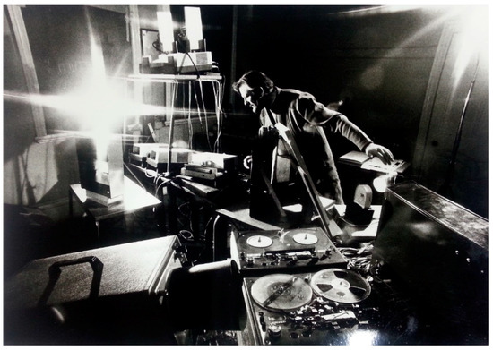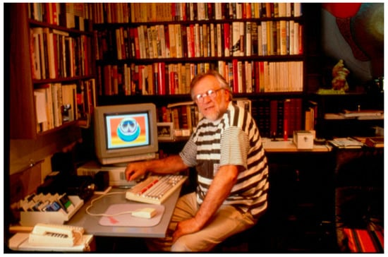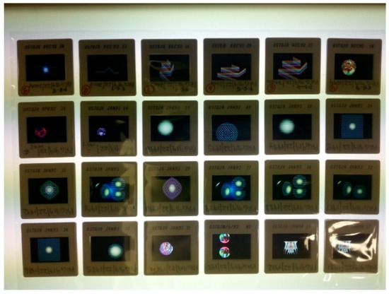 Originally trained as a painter, Ostoja spent much of his life working with various new technologies. He was an innovator in laser art, beginning in 1968, and was the only Australian to be working in this field at the time. He published an article in a Leonardo special issue on the topic () and is probably best known for his laser art works (Figure 7 shows several images of his laser art). Ostoja’s influences were many—Abstract Expressionism, Bauhaus, Op Art, and more besides. He worked the art/technology nexus for decades prior to using micro-computers. In what looks like an unpublished speech found in the Warsaw archive (dated Sunday 14 June 1992), John Stringer, Senior Curator at the Art Gallery of Western Australian, calls Ostoja “the old master of multi-media” (). As Macdonald puts it in his doctoral thesis, Ostoja was never only doing one thing (). He was an innovator, leading a convergence of electronic media with theatre, dance, experimental film, and light shows from as early as the 1960s ().