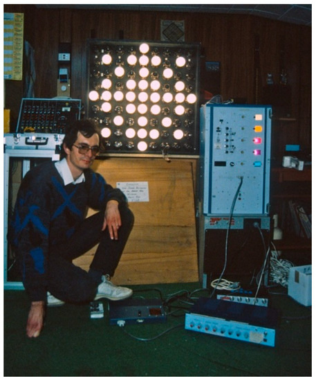 Ostoja received many commissions, including for the creation of a large electronic Christmas star to be installed on the BP building on St Kilda Road, in Melbourne.4 The BP Star commission was first done by Ostoja in 1971 (in which the lights responded to sound ()), but it was not until the 1980s, we think,5 that the stars were programmed using a computer. (Figure 8 shows a photograph of a star installed (we don’t know if it was one of Ostoja’s) on the BP Tower, taken by his friend, photographer Mark Strizic). These star installations instance a convergence of electronics and computing. Ostoja’s collaborator for these pieces, Russell Dahms (shown with a smaller prototype star in Figure 9), recalls writing a small program so that Ostoja could map out the patterns that he wanted for the light sequences. A shot of the screen showing the computer program Dahms developed is seen in Figure 10. Dahms recalls: