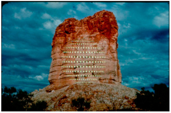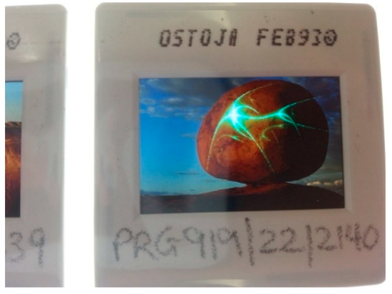 The landscapes with CGI are the latest works we are aware of that were made with the Archimedes. These combined digital graphics with analogue photographs, often of iconic Australian landscapes including Uluru, and the Devil’s Marbles (Figure 22, Figure 23, Figure 24, Figure 25, Figure 26, Figure 27 and Figure 28 show samples from this series). Our research indicates that these images—which variously bear slide dates of late 1992 and 1993—were not exhibited until 1994, the year of Ostoja’s death, at the Adelaide Festival.7