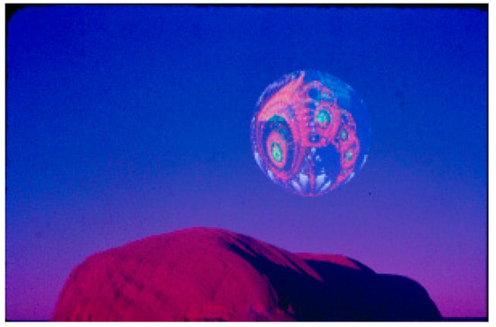 One of Ostoja’s landscapes with CGI, featuring Mandelbrot imagery mapped onto a sphere. The landscape is the very recognisable Uluru. Published with permission. Image courtesy of the State Library of South Australia., PRG919/21/163.