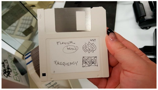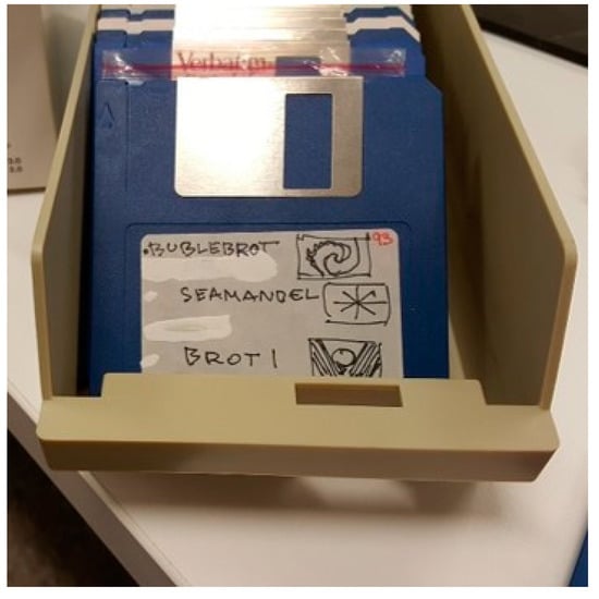 One of Ostoja’s floppy disks, showing his descriptive use of line drawings to label disks, and his reference to the Mandelbrot-derived images using everyday referents which they resembled in some way (“flower”, “frequency”). SLSA disks taken in Flinders Computer Archaeology Lab. Image courtesy Melanie Swalwell. Published with permission of SLSA.