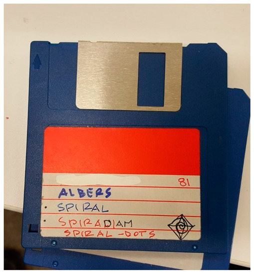 We initially thought that Ostoja must have projected the CGI slide images simultaneously with slides of the landscapes and re-photographed these on 35 mm slide film. He often used multiple slide projectors at installation events as seen in Figure 29, so this was a reasonable guess (there are many such photographs of him with multiple slide projectors). There were no scanlines visible to us in the landscape elements of these works (unlike, say in Figure 4, the Einstein image), suggesting the landscapes were analogue images. Furthermore, in the course of his proposal to Tony Salvis of Barton computers in Collingwood (to whom Ostoja proposed trading some of his artworks for a computer memory upgrade, from 1 to 4 MB), Ostoja suggested that the images might be exhibited this way, though he clearly recognised that this was not an ideal solution. However, projection on the one screen would not explain how the black backgrounds of the CGI images were masked. We assume some kind of scanner must have been used, though this is speculation at the moment. Currently Ostoja’s slides are accessible to researchers, but not his disks, so our analysis has been conducted without the benefit of access to the digital files. It is hoped that further clues as to the creation of these images might be found once Ostoja’s floppy disks are imaged and made accessible to researchers (Figure 30, Figure 31 and Figure 32 show some of his floppy disks, from the State Library of South Australia archive). Access to the disks may also clarify which computer system the Christmas star was programmed on.