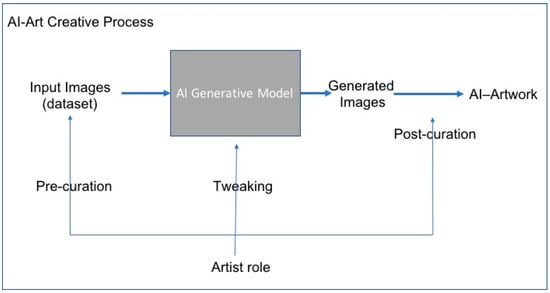 Figure 1 explains the creative process that is involved in making this kind of AI art. The artist chooses a collection of images to feed the algorithm (pre-curation), for example, traditional art portraits. These images are then fed into a generative AI algorithm that tries to imitate these inputs. The most widely used tool for this is generative adversarial networks (GANs), introduced by Goodfellow in 2014 (Goodfellow et al. 2014), which have been successful in many applications in the AI community. It is the development of GANs that likely sparked this new wave of AI Art. In the final step, the artist sifts through many output images to curate a final collection (post-curation).
