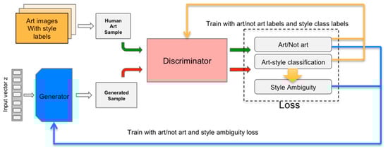 At Rutgers’ Art & AI Lab, we created AICAN, an almost autonomous artist. Our goal was to study the artistic creative process and how art evolves from a perceptual and cognitive point of view. The model we built is based on a theory from psychology proposed by Colin Martindale (Martindale 1990). The process simulates how artists digest prior art works until, at some point, they break out of established styles and create new styles. The process is realized through a “creative adversarial network (CAN)” (Elgammal 2017), a variant of GAN that we proposed that uses “stylistic ambiguity” to achieve novelty. The machine is trained between two opposing forces—one that urges the machine to follow the aesthetics of the art it is shown (minimizing deviation from art distribution), while the other force penalizes the machine if it emulates an already established style (maximizing style ambiguity). These two opposing forces ensure that the art generated will be novel but at the same time will not depart too much from acceptable aesthetic standards. This is called the “least effort” principle in Martindale’s theory, and it is essential in art generation because too much novelty would result in rejection by viewers. Figure 3 illustrates a block diagram of the CAN network where the generator receives two signals, one measuring the deviations from art distribution and the second measuring style ambiguity. The generator tries to minimize the first to follow aesthetics and maximize the second to deviate from established styles.