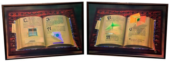 The holographic dispositif establishes a distinctive spatial structure. However, the holographic space has an important impact on the representation of time that is more peculiar than any other imaging technology. In physics as well as in philosophy, space and time are interlinked. This is not different in holography and it is an important characteristic of my experiments. In my Tractatus Holographis hologram, a page seems to turn when the viewer moves laterally. In Graphis (2009) (Figure 2), texts in Arabic, Chinese, Latin, middle French, Greek and other content elements appear and disappear and the whole scene changes in synchronization with the viewer’s movements.
