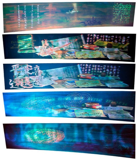 Graphis, 2009. Five views of the synthetic hologram, 3 m × 60 cm, created by author. (see: http://www.i-jacques.com/graphisen.html).