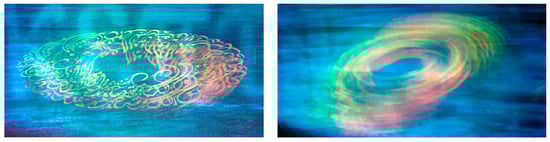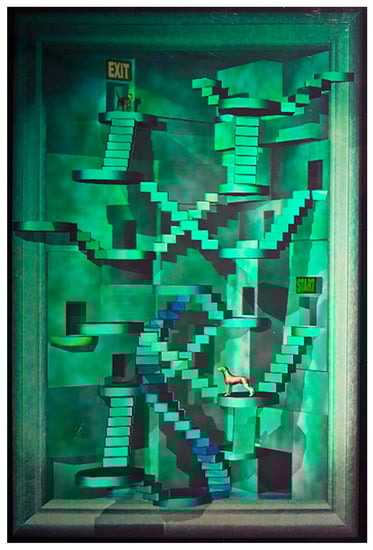 While the artist composes a space, time belongs to the viewer. Linear narration is shattered in holography. Visual information and its discursive attributes are contingent on spatial synchronization between elements and the viewers. Alignments, juxtapositions, superpositions, colors, transparent and reflective objects, directional vectors and focus points—all these formal elements and their significations can vary with multiple views and the spatial interactivity that holography provides. In a recent hologram, Maze (2018), I tried to use this spatiotemporal characteristic in the solution of a visual puzzle (Figure 4). The only way to solve this labyrinthine composition of stairs is for the viewer to move laterally and change viewing angles so that some parts of the stair’s structure will appear or disappear. The movements of the viewers’ bodies, the movements of their gazes, and the hologram’s kinetics all contribute in this interactive hologram. “Tempus non est sine motu” (Time does not exist without motion) ().