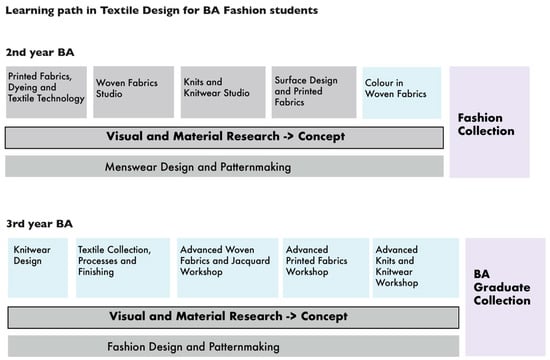 Learning path in Textile Design for BA Fashion students. The chart illustrates the compulsory courses in grey and elective courses in light blue. The courses in fashion design and patternmaking have been simplified to one block for the purpose of this chart (created by author).