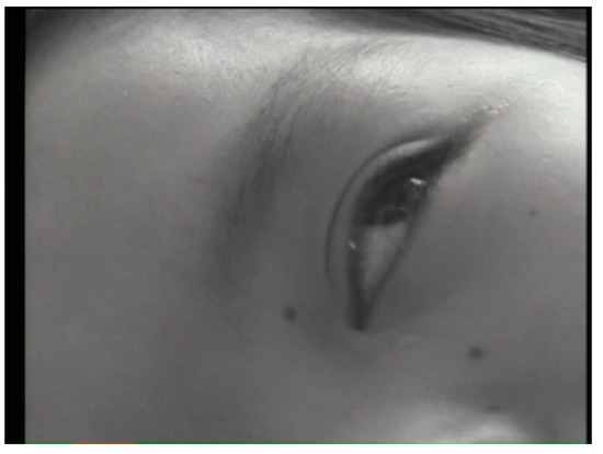 The extreme close-up of Kumiko’s right eye. Still from The Children of Minamata are Living (1965), director Tsuchimoto Noriaki.