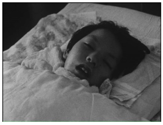 The medium shot of Kumiko awake in bed. Still from The Children of Minamata are Living (1965), director Tsuchimoto Noriaki.