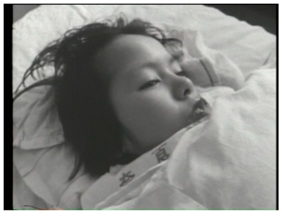 In the short sequence of Kumiko, she is filmed in the medium shot while sleeping with her eyes closed, from the left and then from the right (Figure 3). Without her signature big open eyes, and also without explanation of who she is (her byname ikeru ningyō had been well established by the time of Tsuchimoto’s filming) other than her name and patient number, it might be rather difficult to recognize her just by this image. Two medium shots that both last a few seconds maintain the sense of comfortable distance, allowing the audience to observe her without getting too close to her, if through the non-immediacy of screen. The fact that she is visibly sleeping, instead of laying down barely responsive as in The Children of Minamata are Living (Figure 4), might also make the act of witnessing her feel a little less guilty. At the same time, however, filming her asleep gives Tsuchimoto a different sort of mental qualm from filming her awake but not responsive, again reverting to the question of how to capture a subject who does not return the gaze to the camera. Compared to the image of 15-year-old Kumiko in The Children of Minamata are Living, that of 20-year-old Kumiko in Minamata does not reveal much change at a glance. Yet, Tsuchimoto senses her early decrepitude, already starting to shrink and emitting an odor of old age after the lifelong battle, she has lost the power to thrive and is about to rush away her short life.16 Taking this “aging” factor into consideration might enable a more sensitive reading of the different level of Kumiko’s responsiveness along with the environmental factor. In The Children of Minamata are Living, as the ending point of the long tracking shot, the camera comes to stop to focus on her nicely-lit face, eventually framing her face in the close-up. The youthfulness of an adolescent girl that is sensible through her appearance makes up for her lack of response and movement. In Minamata, the still camera simply frames her in the stable medium shots from both sides; along with the darkness of the room, the fast-asleep Kumiko seems to be almost beginning a gradual process of implosion, thus rejecting the external world even more categorically than before. When facing this rapidly aging woman in a secluded hospital ward, Tsuchimoto might have felt a sense of relief, or felt less guilty, that she is asleep and thus does not return the gaze—aside from the fact that even if she were indeed awake, it would be nearly impossible to tell whether she is returning the gaze or having her eyes open aimlessly. The deletion of Kumiko’s sequence from the wider-circulated version deprives the audience of the opportunity to witness the person who symbolically embodies the ordeal of being a Minamata disease patient, of the life consumed by the darkness of an incurable, man-made (or corporate-made) disease, and awaits her slow death in silence.