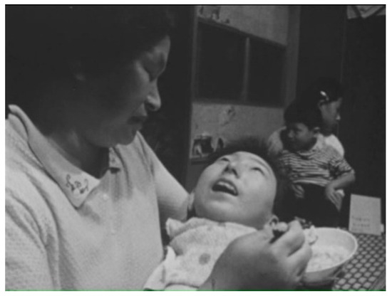 Such an image of Tomoko, with the impression she leaves in the hearts of beholders, is what Tsuchimoto aims to capture in the scene at the Kamimura household in Minamata. In the first shot, the camera frames Tomoko’s younger siblings and her father and then pans to the left to show her in the arms of her mother, being fed. Throughout the scene, the camera alternates between the image of Tomoko and that of her siblings, sometimes through pan shots and at other times in separate shots. The comparison with her healthy siblings accentuates her helpless state. Furthermore, the degree of physical destruction she suffered due to mercury poisoning is highlighted by their facial semblance and physical differences, which are made visible especially through two sets of pan shots that first show the entire body of Tomoko’s youngest sibling and then frame Tomoko.