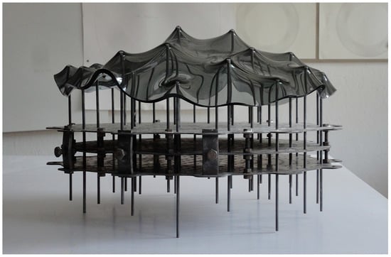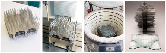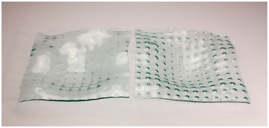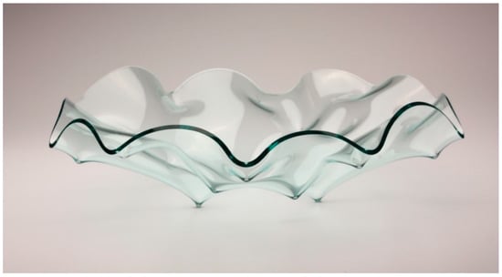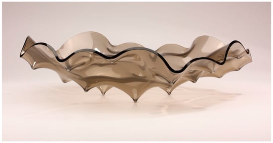 Alongside the reflections on the findings in regards to the environmental innovation and specific tools involved in this investigation of toolmaking, it is also relevant to reflect on the importance of another key aspect in this study; this aspect concerns the fabrication medium, sheet glass, which the RPT tools created in this study were intended to manipulate. The characteristic of this particular medium played a critical part in the practical elements of this study. While it could be argued that the characteristics of all mediums are relevant in most (perhaps nearly all) tooling and moulding processes, the required material characteristics of the moulding medium in this study are specific rather than general and only the particular properties of semi-molten sheet glass at a specific temperature would work with this tooling system. In order to successfully develop the tooling systems and fully exploit the creative potential of the RPT tools, the author had to gain extensive experience with float glass as a manufacturing medium and make adaptions to the RPT systems in response to the developing material knowledge of this particular medium. Equally, it is also relevant to note that as well as being one of the key contributing factors to the functionality of the system and aesthetic of the pieces (see Figure 13), the material characteristics of semi-molten sheet glass also had constraining effects on the creation of the pieces, with certain pin positions causing uncontrollable warping—or creating unattractive scratch marks in the glass pieces caused by pin slippage. As a result of undertaking this project, the author increasingly considers the importance that intimate material knowledge has in innovation scenarios involving the creation of physical artefacts. Considering the current situation in digital fabrication, it is the author’s view that projects frequently overlook the material characteristics of the fabrication medium as one of the key elements for innovation in a tool creation scenario.