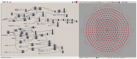 The Grasshopper definition created to aid the development of the files for the matrix plates for the round glass RPT systems. The matrix plate design, illustrated in the image to the right, is defined by the Grasshopper script on the left, (images by Jorgensen, T. 2011).